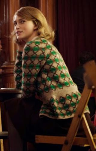 And sealed the deal when she debuted this green Fair Isle beauty. These are never colors that I would choose for a Fair Isle sweater, but my eyes were drawn to the stunning green. It popped in every scene, especially since most of the other characters wore more muted color tones. It’s a bold statement but manages to keep its classic look. And the simple detail of leaving out one repeat of the green pattern creates the illusion of an amazing waistline. It’s the little details that can make such an impact.