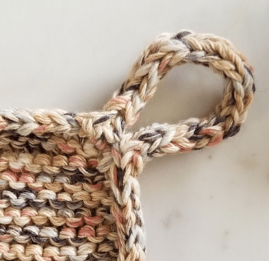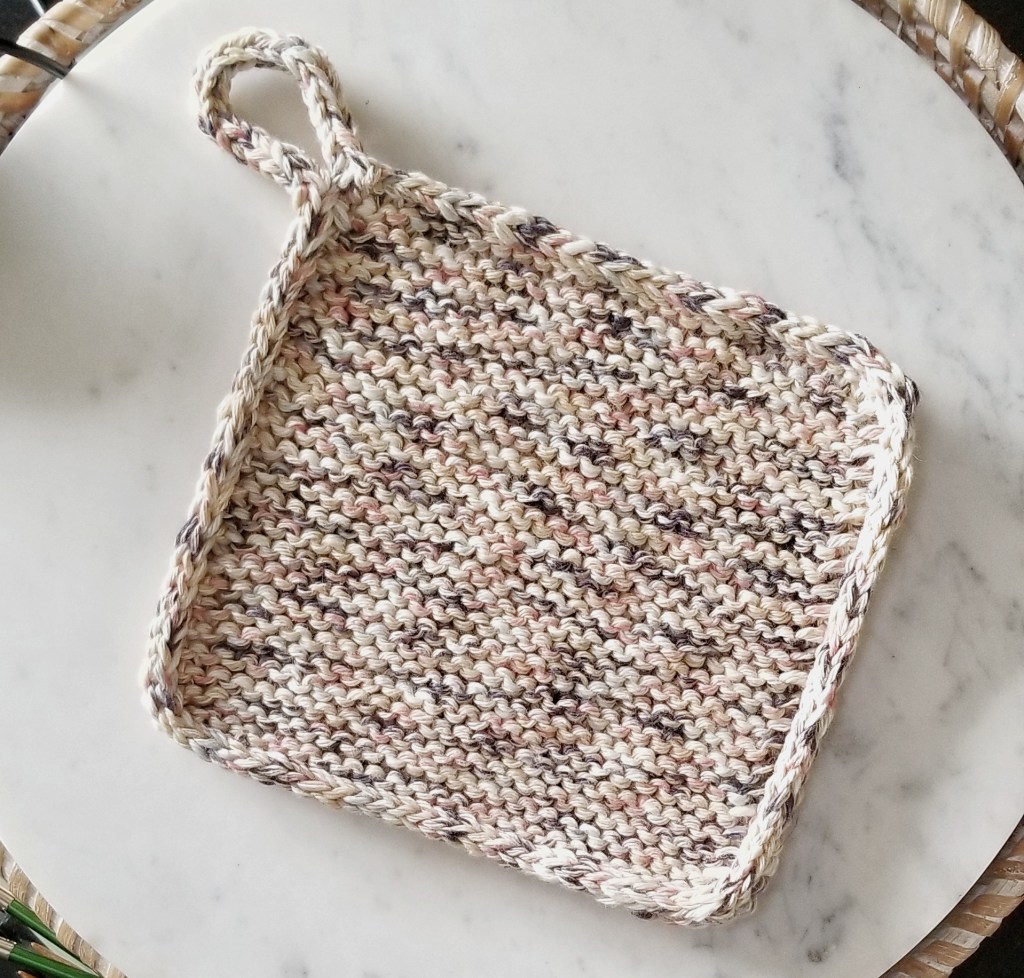 It’s a simple garter stitch hotpad worked with DK or light worsted weight cotton yarn held double. The border is an a attached I-Cord that includes a detached loop for easy hanging.